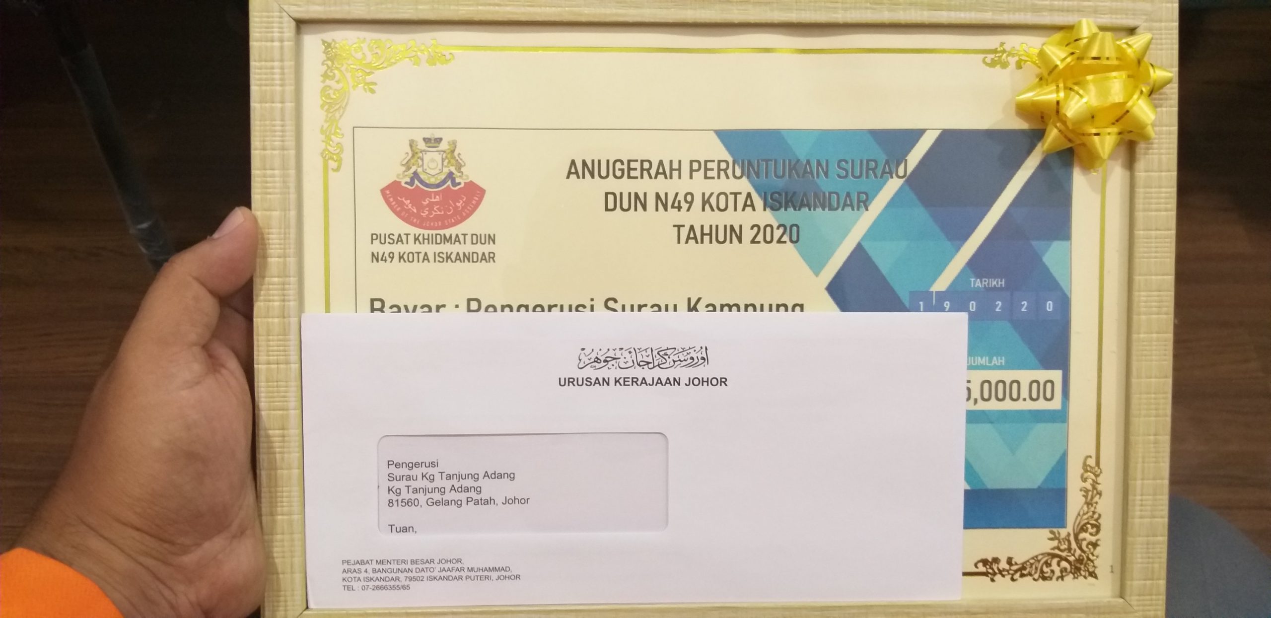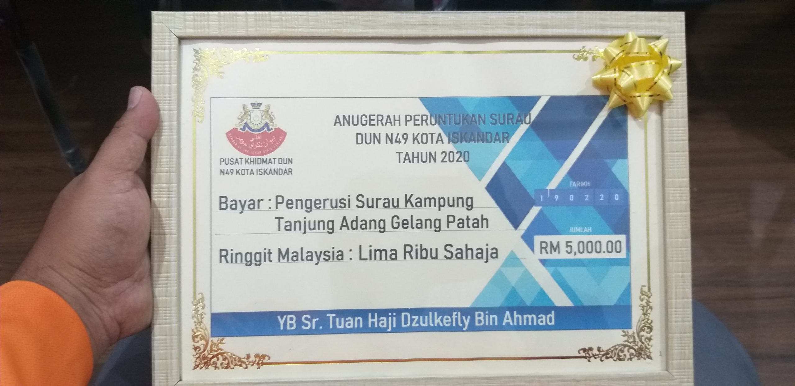 20 Feb 2020, Rabu, Pusat Khidmat DUN Kota Iskandar. Alhamdulillah dan syukur diberi kesempatan mewakili AJK Surau Kampung Tanjung Adang menerima sumbangan sebanyak RM 5,000 yang disampaikan oleh YB Sr. Dzulkefly Ahmad, Exco Perumahan Komunikasi dan Multimedia Negeri Johor dan Adun Kota Iskandar di Pusat Khidmat DUN Kota Iskandar.