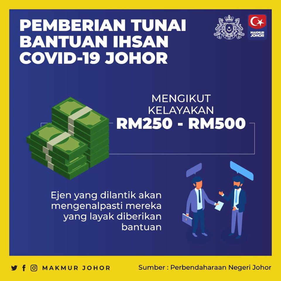 JOHOR BAHRU, 17 April – Kerajaan Negeri Johor akan memberikan bantuan tunai antara RM250 dan RM500 kepada rakyat yang bukan tergolong sebagai penerima Bantuan Sara Hidup (BSH) atau Bantuan Prihatin Nasional (BPN) dalam berhadapan kesan pandemik COVID-19.
